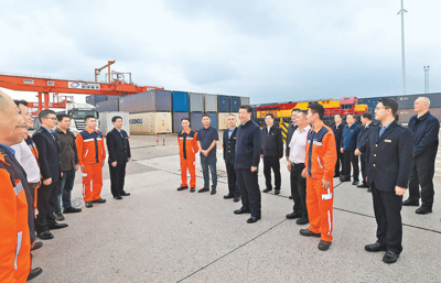 随后,习近平来到重庆铁路集装箱中心站,听取货物集散、运输路径、运营成本和效益等介绍,同货车司机、列车司机、装卸工人、场站管理人员等亲切交流,询问他们的工作强度、劳动保护、节假日休息和收入情况。习近平说,大家在物流一线,也是在对外开放一线,通过你们的辛勤劳动,很多商品跨越山海、走向世界,你们的工作很有意义。推动西部大开放、促进西部大开发,物流很重要,大家要继续努力,不断创造新的业绩,作出新的贡献。