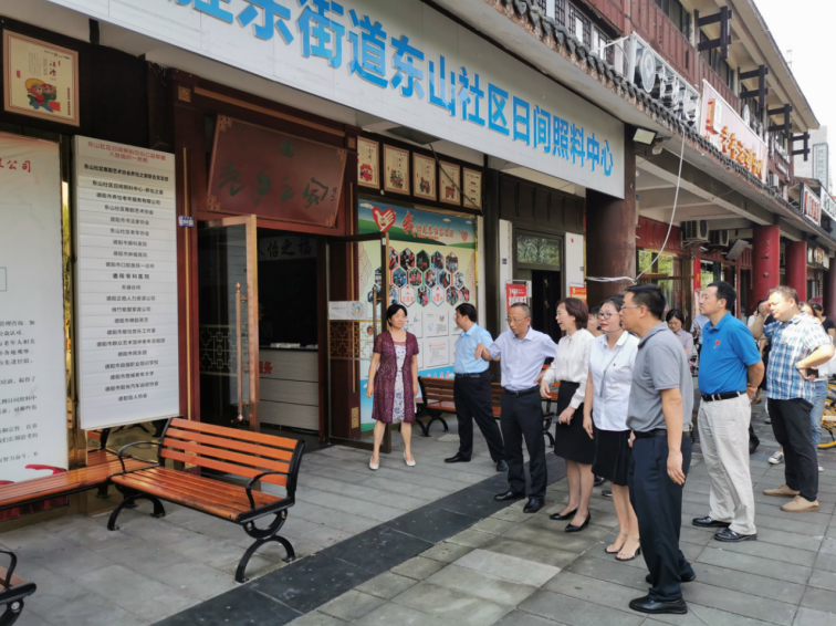 王锐一行首先参观德阳经开区东山社区日间照料中心、法律公共服务工作室、社区警务室、妇女儿童中心、心理咨询室等功能室,调研乐安社区服务大厅、社会组织“双孵化”中心、乐蒿双创基地、红色大讲堂、共驻共建先锋驿站等阵地建设,并听取社区相关情况介绍。