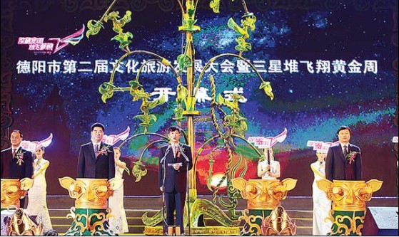 壮观的飞行表演,精彩的文艺节目;此起彼伏的欢呼声,幸福洋溢的笑脸。昨(25)日傍晚,由徳阳市委、市政府主办,广汉市委、市政府、德阳市旅游局、德阳市文化广播影视新闻出版局承办、中国民航飞行学院协办的“德阳市第二届文化旅游发展大会暨三星堆飞翔黄金周”在广汉文体中心拉开帷幕。省政协副主席方小方,市委书记李向志,市委副书记、市长陈新有,市人大常委会主任刘守培,市政协主席刘哲,市委副书记、市总工会主席丁成明,四川师范大学、中国集邮总公司、中国民航飞行学院相关领导出席开幕式。方小方宣布德阳市第二届文化旅游发展大会暨三星堆飞翔黄金周开幕。